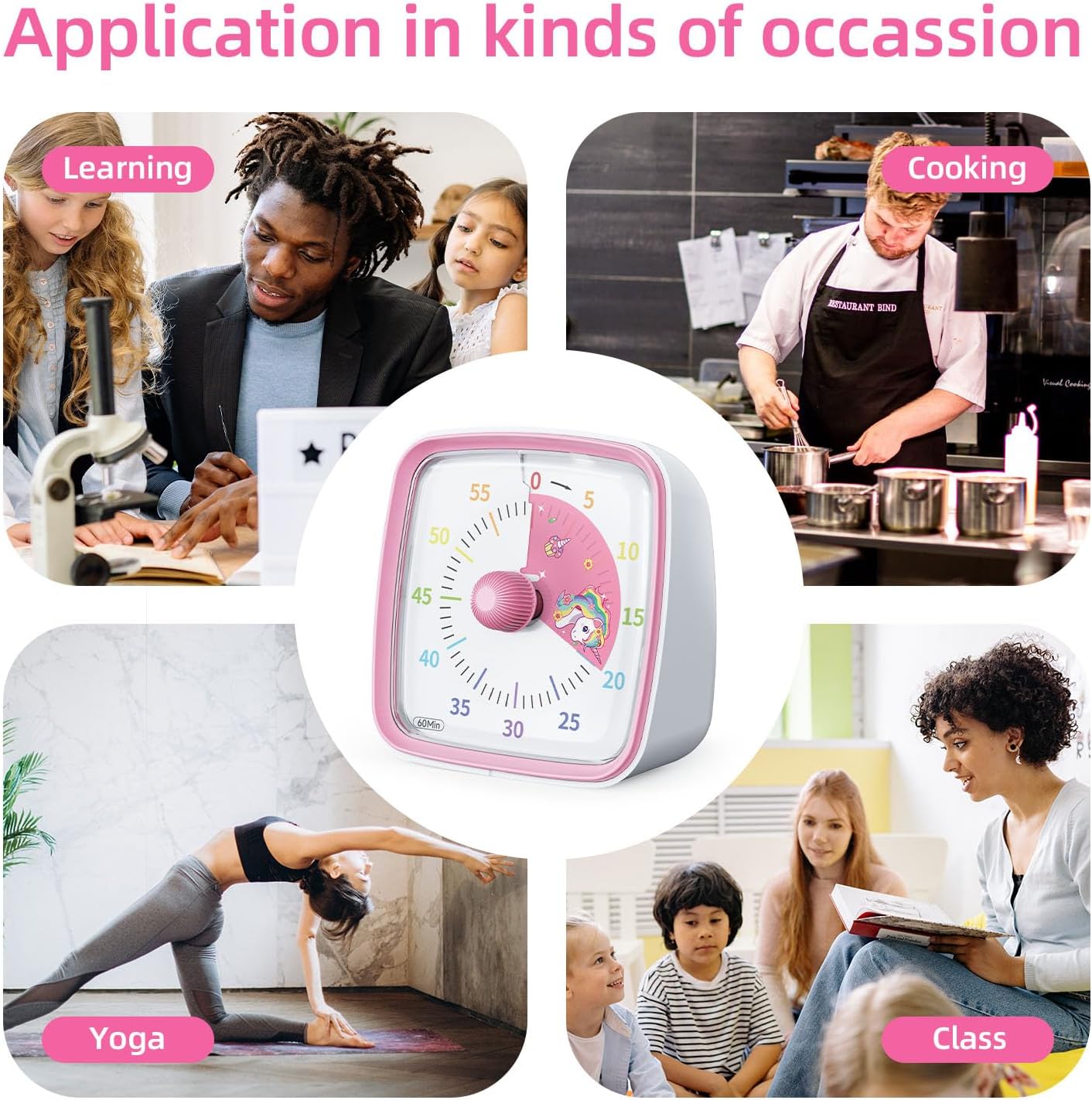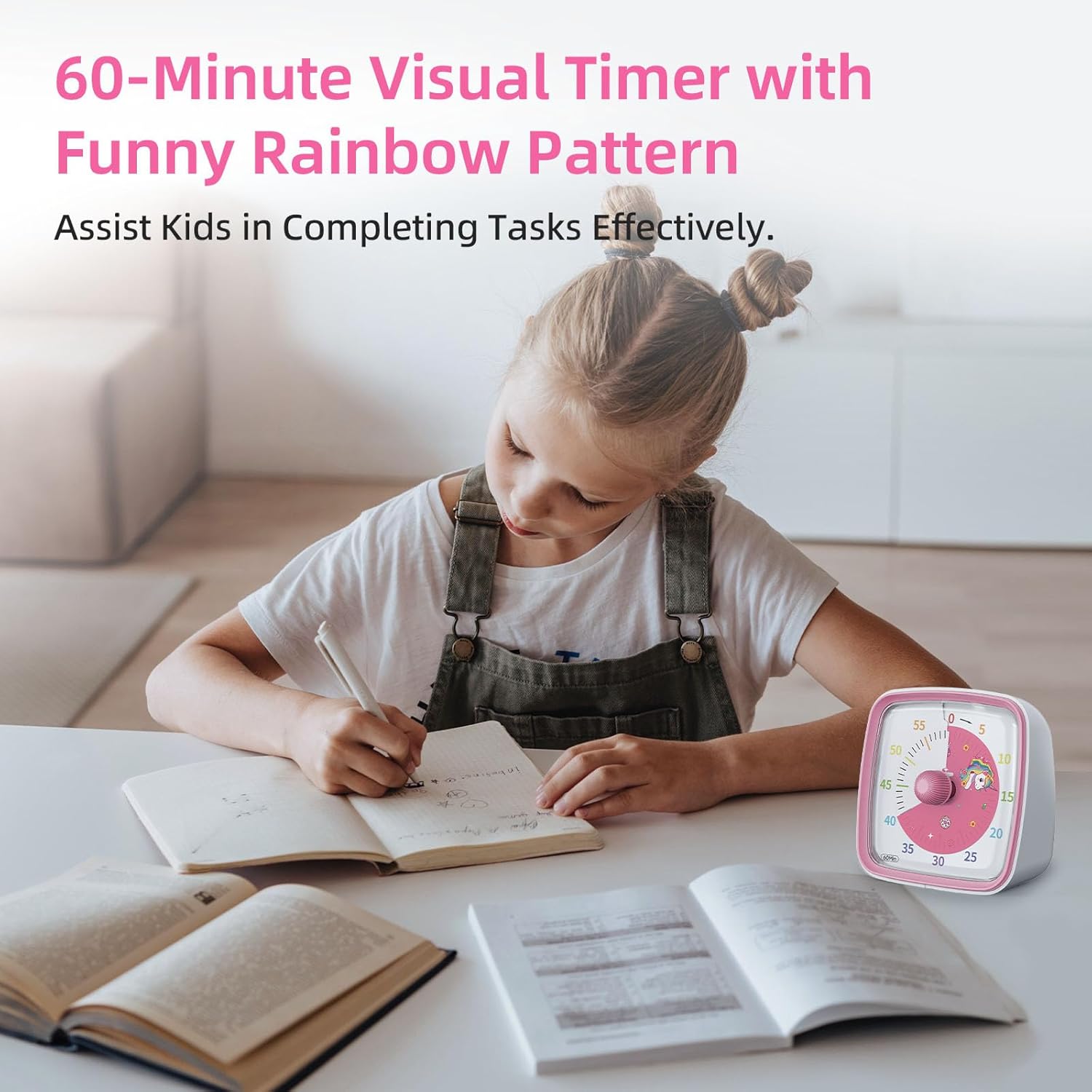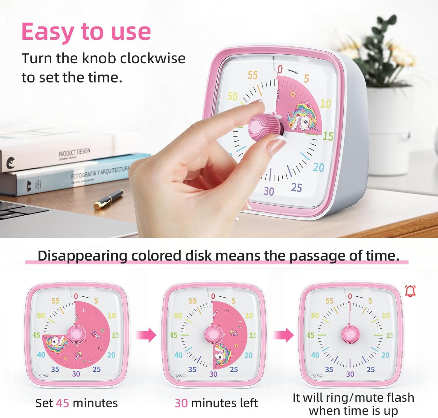 Yunbaoit Visual Timer with Night Light, 60-Minute Unicorn Countdown Timer for Kids and Adults, Time Management Tool for Home, School, Kitchen, or Office (Pink)
