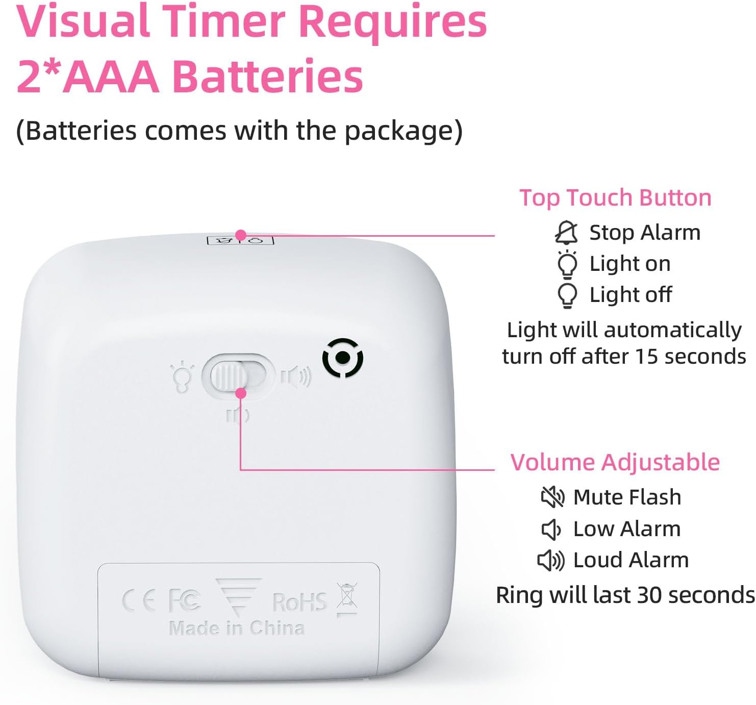 - Optional Audible Alert: You don't need to worry that the ticking noise makes you disturbed. The visual timer has 3 alarm modes: mute flash, low, and loud. You can choose the various alarm modes on different occasions